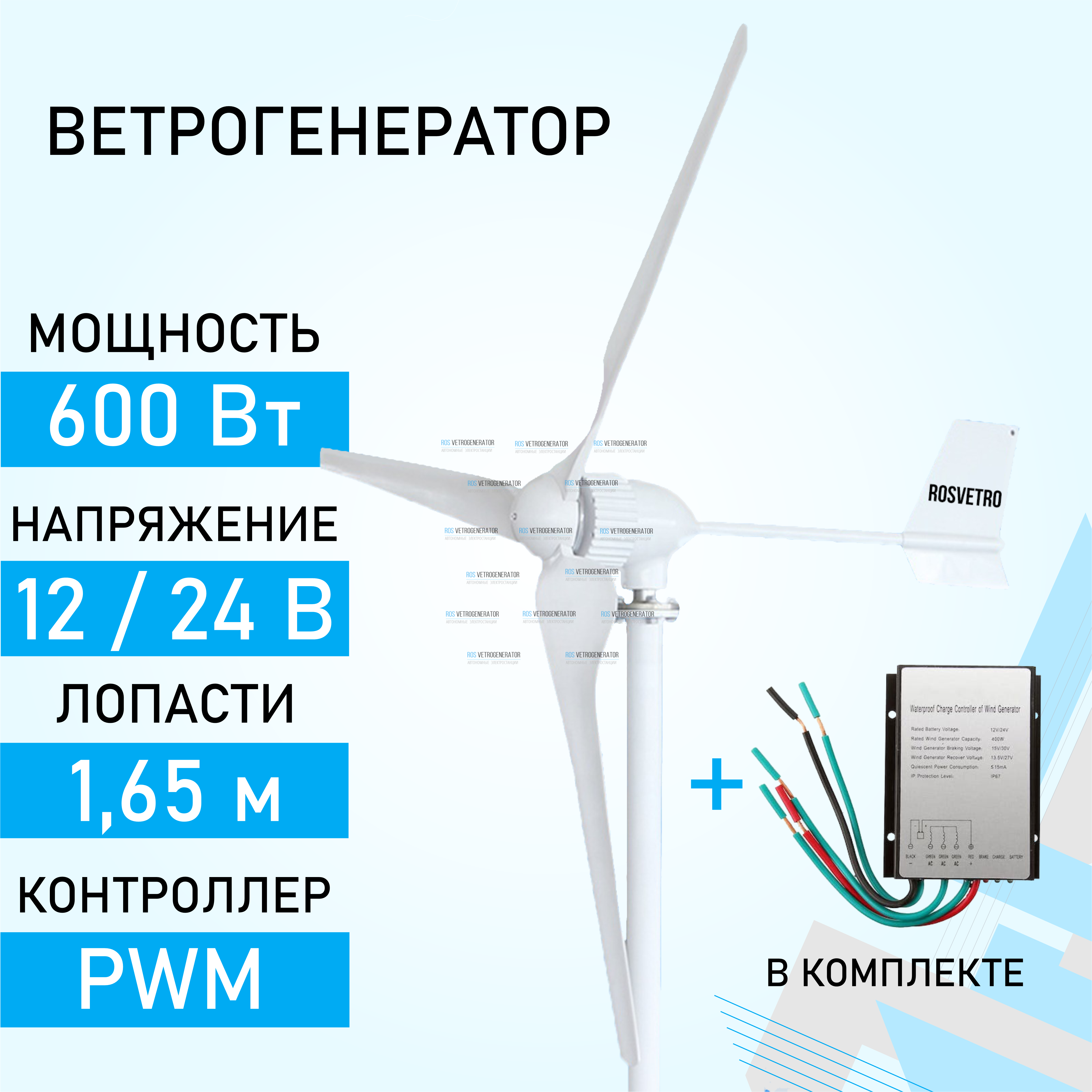 ROSVETRO SS-600 — это горизонтальный ветрогенератор номинальной мощностью 600 Вт, которая поставляется в комплекте с контроллером PWM.